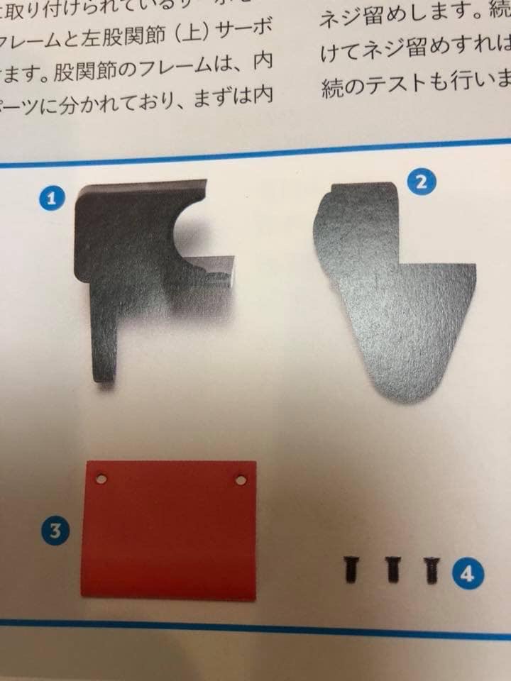 脚を前後に動かす股関節(下)サーボモーターにID番号を書き込み、これまで組み立ててきた左脚に取り付けます。
